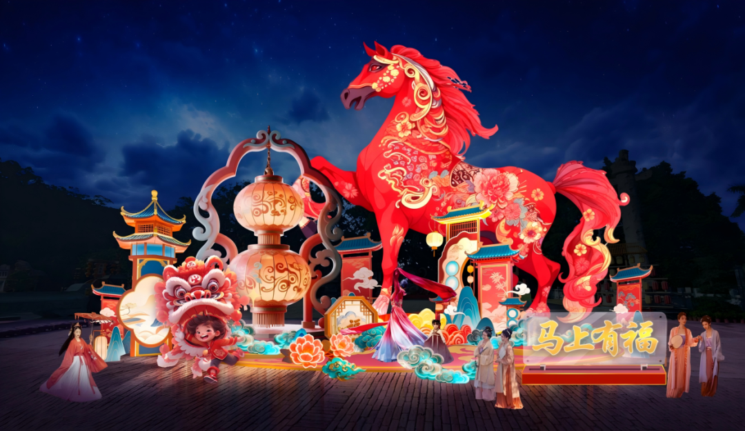 红彤彤的骏马,满载灯笼、舞狮和笑脸,踏着光影向你奔来,这大概就是“年味”的具象化了吧!
